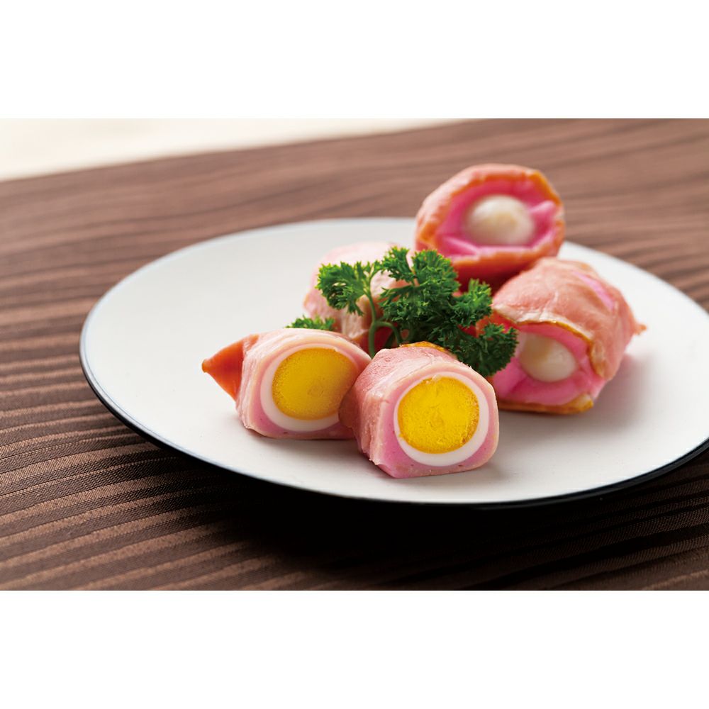 うずら卵をベーコンと魚肉で包んだ珍味かまぼこ。
